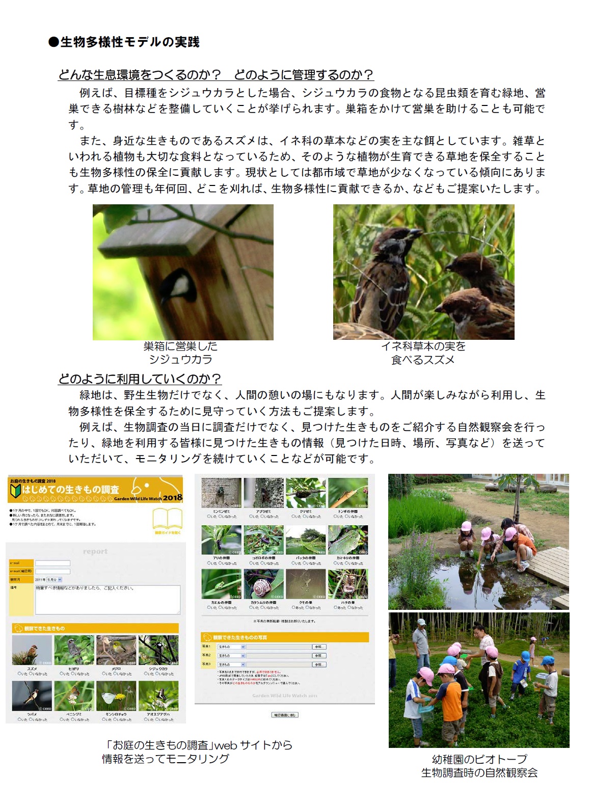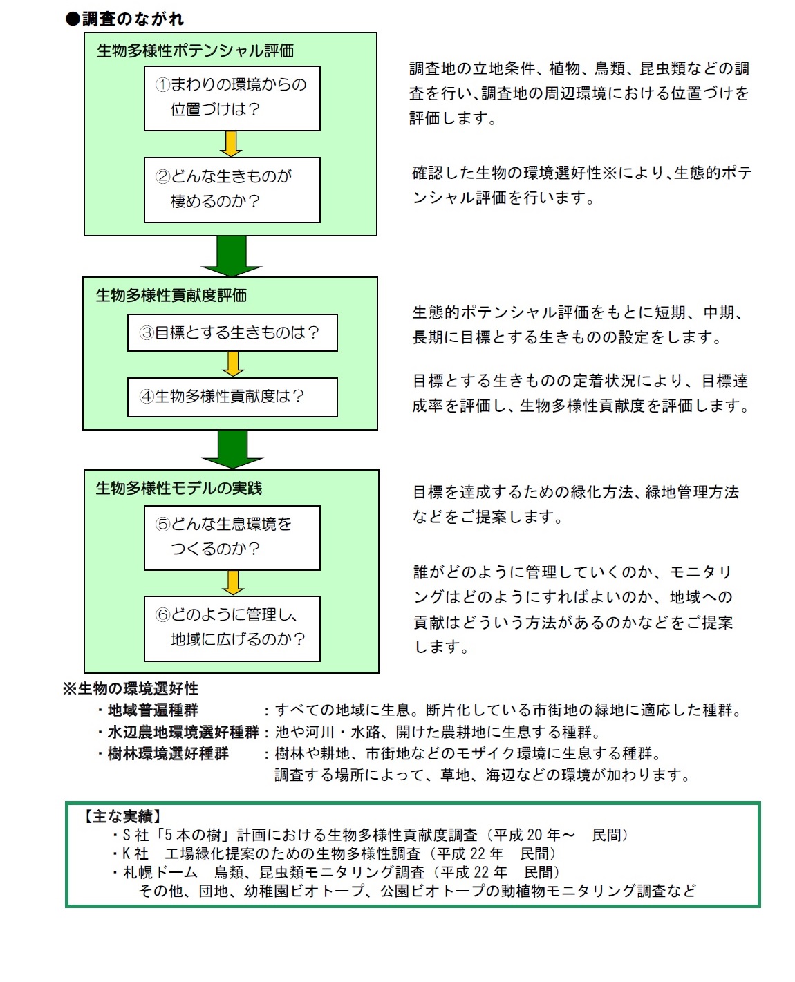 生物多様性調査 企業等の所有される森林、ビオトープ、工場の緑地などの生物多様性を評価し、生物多様性を高める管理方法、活用方法等について、ご提案します。新規に造られる場合も、事前調査、基本計画の策定、実施計画・設計、施工監理、モニタリング、維持管理、活用方法までをサポートします。